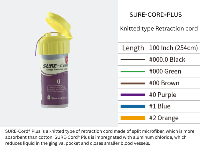 SURE-Cord® Plus 是一種編織型排齦線,由裂解超細纖維製成,其吸水性優於棉質材料。SURE-Cord® Plus 經氯化鋁浸漬處理,可減少齦溝內液體並閉合較小的血管。