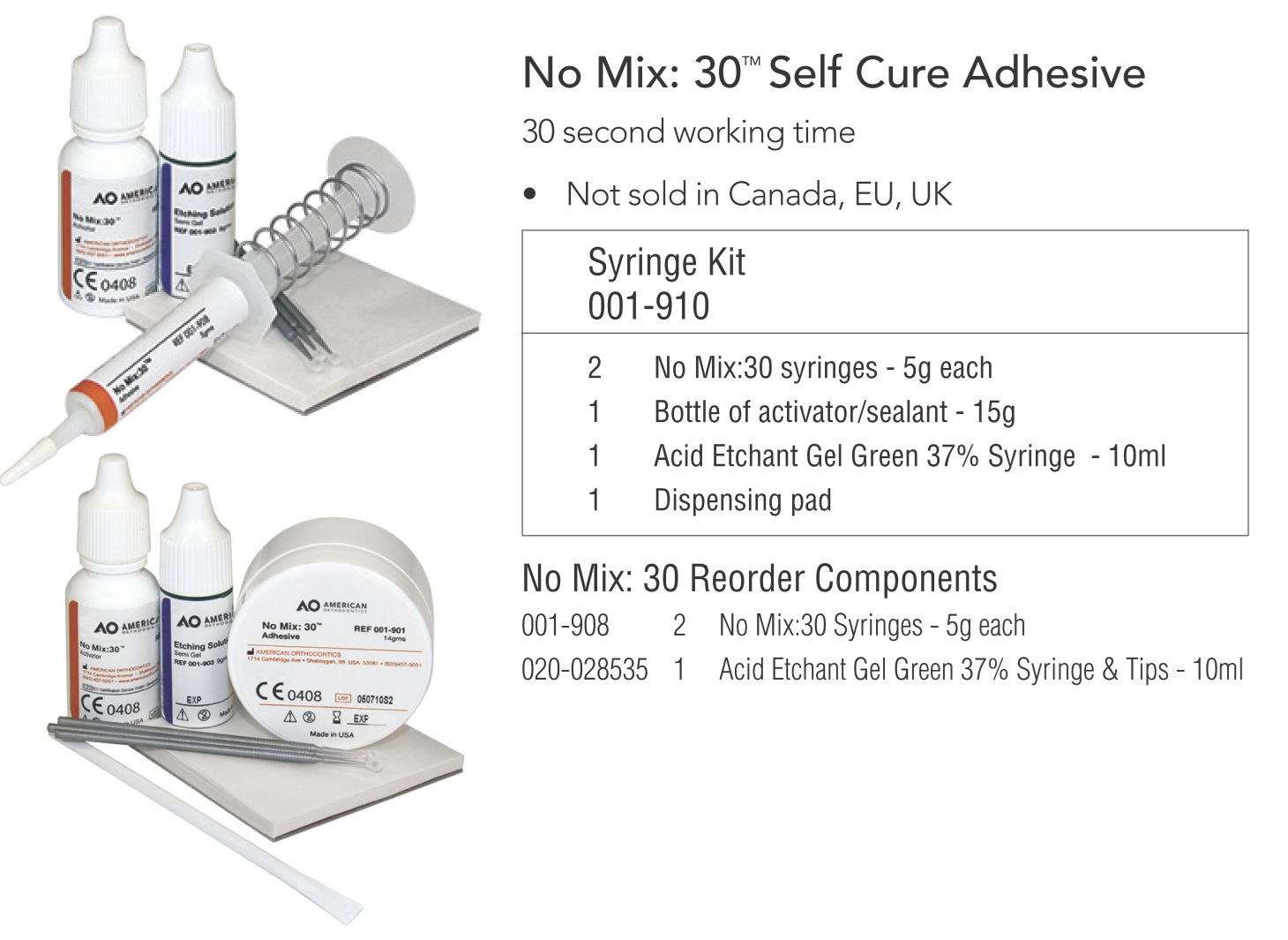 The Self Cure Adhesive Kit (No Mix:30) is a chair-side package that contains everything an orthodontist needs to bond metal, ceramic or plastic brackets to teeth without using a curing light. 30 second working time.