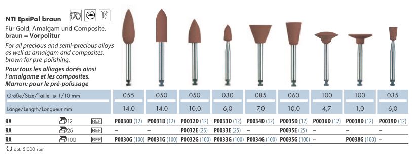 For all precious and semi-precious alloys as well as amalgam and composites polishing. Brown for pre-polishing; Green for high-gloss polishing. RA Shank.