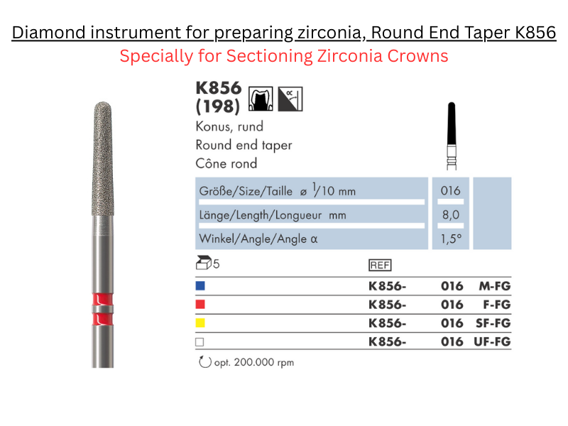 K856 round-end taper diamond burs are purpose-built for zirconia preparation—specifically for sectioning zirconia crowns.