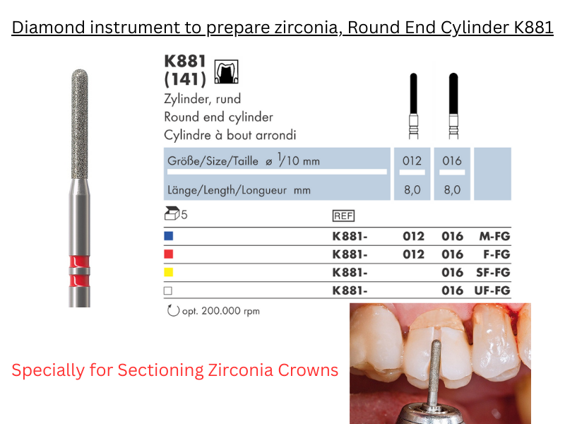 K881 round-end cylinder diamond burs are purpose-built for zirconia preparation—specifically for sectioning zirconia crowns.