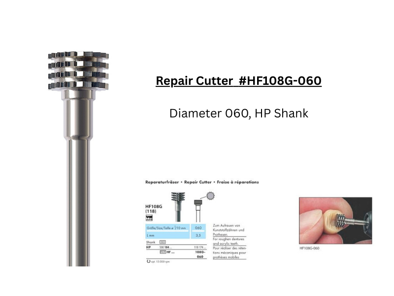 The Repair Cutter is designed for roughening dentures and acrylic teeth. HP Shank.