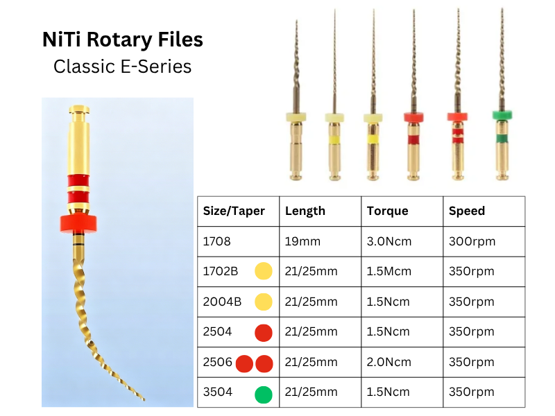 The Classic E-Series NiTi Rotary Files are engineered for efficient, safe, and flexible root canal preparation. Their optimized cross-section delivers effective cutting action while minimizing screw-in effects and reducing the risk of file breakage.